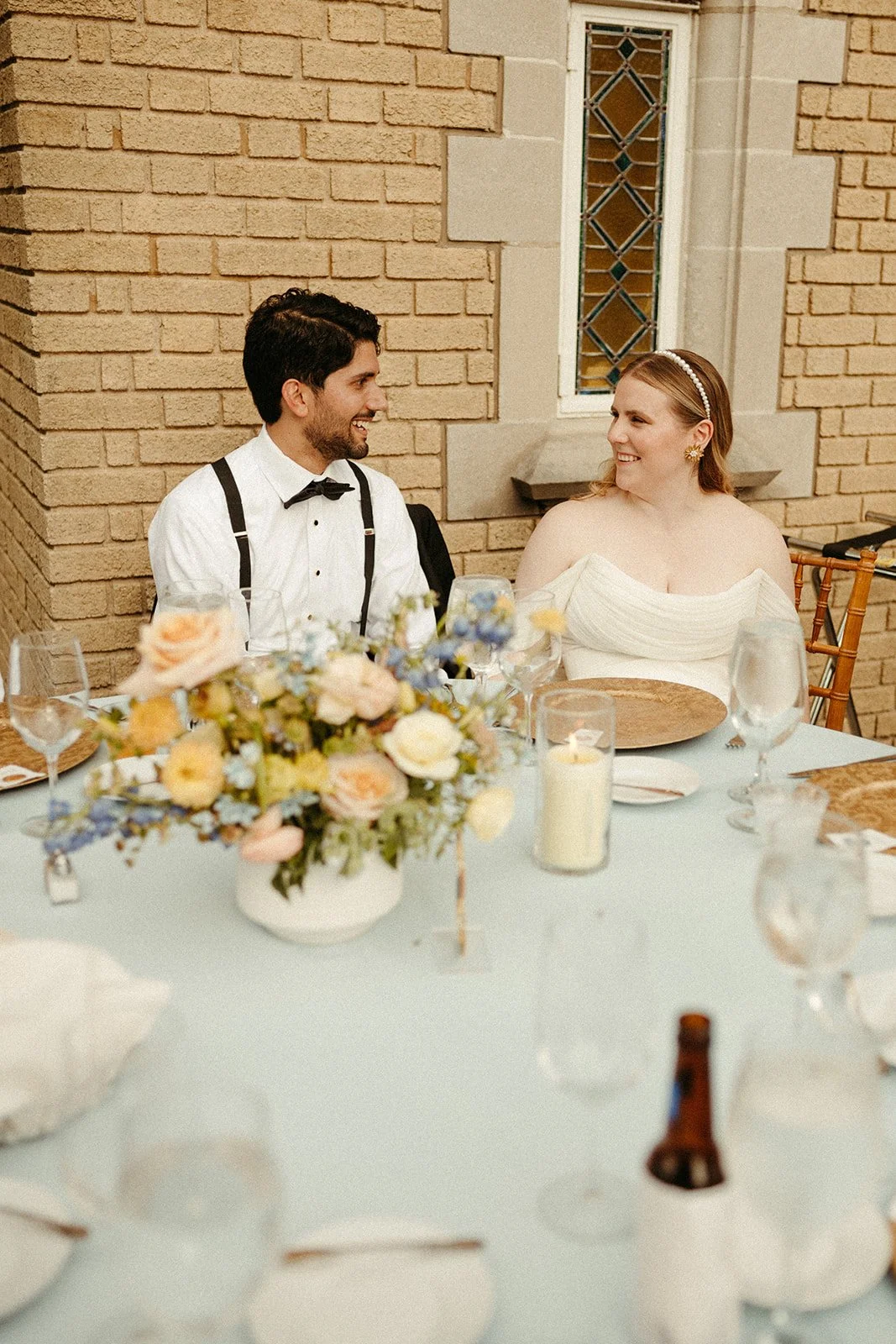 Cocktail Hour transitioned outside to the Terrace for the reception. Round tables with the prettiest blue linens and unique floral centerpieces were a perfect accent against the bricked exterior of the mansion. The couple shared their first dance and dinner with their guests under the bistro lights that were strung overhead. After dinner, the party moved inside to the Solarium where the couple danced the night away with their friends and family.